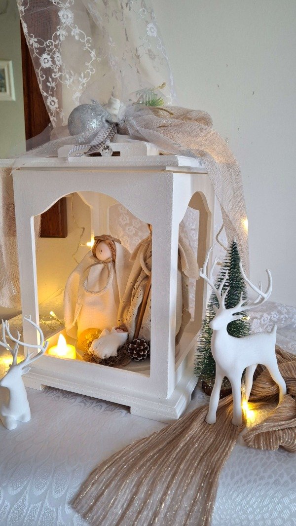 Delicado fanal de madera blanco con nacimiento en tonos neutros.
